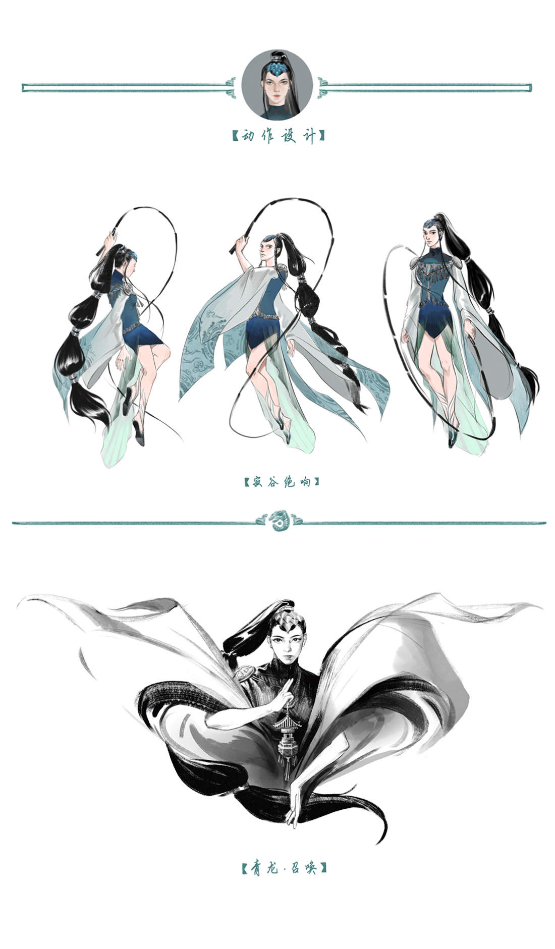 以驭龙闻名的寂谷部落生活在大陆西南部的层层迷雾中,十九岁的于渊是部落首领的长女,也是未来的族长继承人。 这组作品以青蓝为主色调,吸收了传统汉服、苗族服饰的特点,融入现代审美元素,力图契合人物沉稳又不失明媚的形象特点。