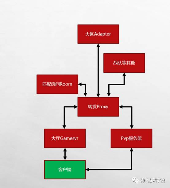 ProxyAdapter是上线后加入的,最开始上线只有四个大区,手Q、微信、Android、iOS四个环境,最开始Android的玩家不能和iOS开黑。开始Android和iOS分开也有一定原因,我们之前设想Android会先更新,iOS后跟新,以保持版本更新的稳定性。但后来我们希望Android和iOS的玩家可以因为关系链一起开黑。所以当Android、iOS版本更新频率一致时,我们希望不需要部署太多额外的机器资源和开发,直接利用Android和iOS已有的PVP服务器和大区资源,打通Android和iOS的pvp。当Android玩家登录Android大区会连接到Android大厅,iOS登录之后连接iOS大区的大厅,当他们需要开黑的时候,我们通过Adapter把中转模块所有的大区桥接起来,通过一定的算法投递到某个大区,投递的选择和大区资源占比有直接关系。