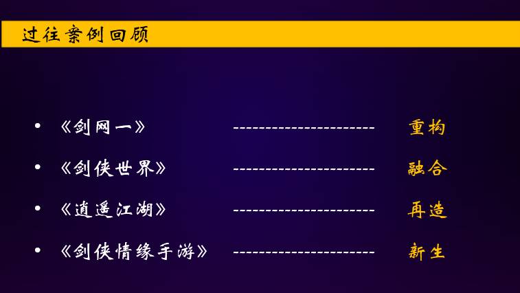 首先第一很重要的一点,所有产品的目的都达到了。不管是《剑网一》的重构,希望做一个更平稳更稳定的产品,还是《剑侠世界》的融合,把剑侠系列原有的用户向外突破,还是《逍遥江湖》希望在剑侠品牌之外成功重塑一款各项数据达标的新产品,以及《剑侠情缘》手游希望把端游用户转到移动端来为他们提供一款让他们满意并能够长期玩的产品,所有的目标都达成了。