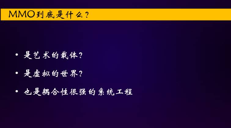 MMO到底是什么?在座很多人可能也做了很长时间,我们也问过自己这个问题。如果我们不能了解、分析清楚MMO到底是什么的话,我们怎么能够找到明确的目标?怎么能够控制它每一步不出问题?怎么能够达成我们的预期?怎么能够让我们的团队知道我们到底要怎么样做到它?肯定都是很难的。