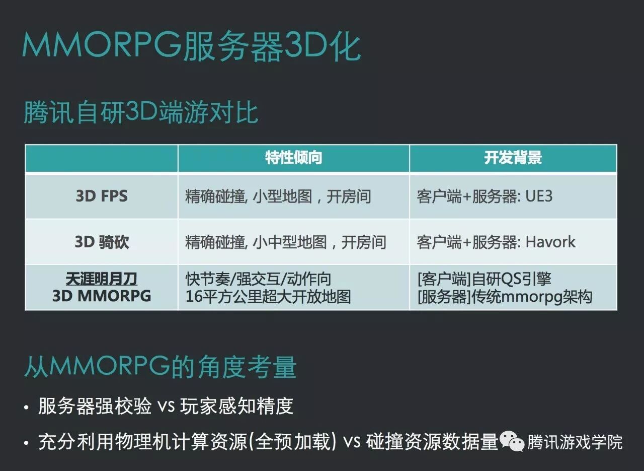 天刀在服务器做3D化时会存在哪些挑战?天刀的特点和早年间的MMORPG不一样,那些游戏的技能释放频率比较低,更多是站桩打。天刀作为一款ARPG游戏,打起来的节奏非常快,攻击方和受击方都要边打边移动。另外我们的地图很大,产品设计之初就确定为产品的特点或者优势,边长4公里,单张地图的大小达到16平方公里。从MMOPRG玩家的角度,他们对精度的感知更低,所以我们无需采用前两者那么高精度的方案. 为了让玩家在游戏内自由迁徙的同时,服务器各个场景的负载还是能够做到比较好的均衡,我们把每个场景都加载了全部的地图资源。天刀的单张地图有16平方公里这么大,精度还需要到单个碰撞格子0.5米,所以单张地图的数据量非常大,五六百MB一张地图,全部加载之后达到7GB。