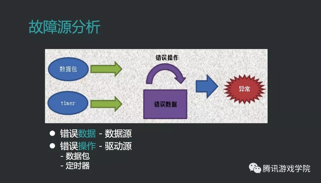 前面提到了故障点,接下来我们对故障点做一下分析。 MMORPG进程的驱动力之一,数据包,无论玩家请求还是内部进程请求或回复,都可以认为是数据包。驱动力之二, 定时器,时间到了就执行定时器里面要求的内容。驱动力发生错误还好处理,在重新起来的时候可以把驱动力扔掉。比如resume后会略过之前的timer,跑下一个timer。再看驱动力之外的因素,所有的程序其实都是逻辑加数据,如果维护的内存数据出现问题,进程也会产生异常。我们很自然的想到做自动检测和隔离,隔离一些数据,也可以隔离一些逻辑。因为逻辑如果频繁造成resume,玩家也不能玩。比如他进行一个操作发现卡了,就又再试,一直试,然后这个进程就不能用了,这样的情况我们也希望隔离。