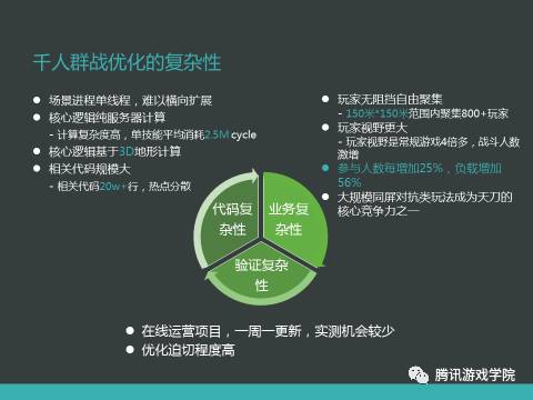 优化面临着非常大的困难,我们的代码复杂性比较高,前面提过一些,比如代码量非常大,单个核心模块非常复杂,它是动作性的游戏,而且技能由很多子技能复合在一起,天刀的技能系统策划不只配表格,还可以在里面嵌脚本。我们已经在运行时把配进去的脚本转化为C++的数据结构执行,但是即便如此,单技能的消耗还是非常高的,有2.5M CPU周期。业务复杂性上,也不能说玩法设计太变态,但是最终达到的情况就是这样,玩家的聚集非常密集,150米见方聚集了800个人,因为天刀开始希望打小怪爽快一点,给每个职业都设计了AOE的技能,又因为是武侠动作游戏,所以公共CD很小,技能释放很频繁,每个人都使劲放技能,每个技能都可以打到周边一片人。参与人数每增加25%,负载增加56%,这是经过实测和测算的,对应我刚才举的例子。