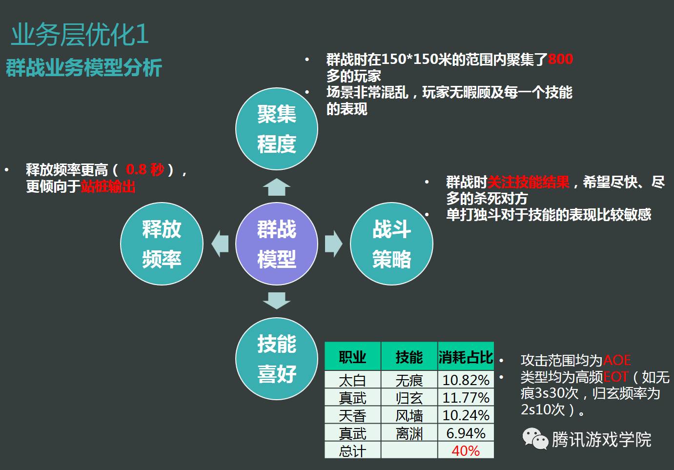 我们还是从业务的角度对群战问题做分析。在释放频率上,大概0.8秒就可以放1个技能。小范围里有这么多人的情况下,玩家虽然很在意我是不是卡,但是不在乎技能应该打到的精确目标。比如周围有ABCDE,而C没有打到,他不太能感受到。战斗策略方面,那么多人聚在一起互相砍的时候,他们更想看到的结果是我放技能,旁边的人死了。到底伤血次数有多少、每次的伤害值,他并不关心。而单独打斗就对于技能的表现,对释放频率,对一边打一边跑这样的东西很敏感。然后看技能喜好,我们给每个职业都设计了比较好用的AOE技能,经过统计发现,其中有一些消耗占比很高。它们的共同点是攻击范围都是AOE,类型均为高频EOT(随着时间生效的技能),比如太白的无痕,3秒生效30次,还有归玄频率为2秒10次,这都是非常频繁的。我们得出的思路是利用这样的业务特点,利用玩家的体验倾向,对重点技能做针对性的优化。