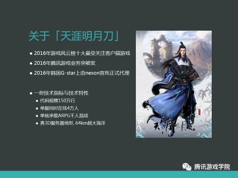 《天涯明月刀》的用户还是很多的,但现在市场逐渐往手游倾斜,所以很多人可能还是不了解市面上端游的产品。《天涯明月刀》可以说是近两年腾讯公司在端游上的标杆,这里主要介绍技术方面的特性。《天涯明月刀》是非常大型而复杂的端游项目,我们在服务器端手写代码的规模就已经到150万行,其中像我们最核心的场景进程,单进程手写代码超过50万行,复杂模块代码量到10万量级,像技能、移动相关的。天刀服务器单组同时在线可以到4万,这是线上实际达到过的,而不是停留在设计容量中的。关于性能方面,单核的承载可以到千人左右,这时技能的释放非常频繁,而且不断有强交互、位移这些出现。另外,说一个比较特色的技术点,天刀的服务器地形是真正的3D,在大型MMORPG里面是一个挑战,后面我会详细展开讲。我们7月份推出了航海资料片,里面的海是非常大的,64公里见方的范围。