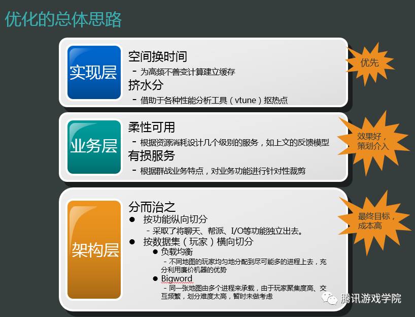 业务层分两个方面,这是腾讯内部经常提到的海量服务策略,像柔性可用,我们设计几个级别的服务,像刚才讲的反馈模型一样。另外可以做一些有损服务,比较经典的说法是玩家渴了,但是他说想喝果汁,我没有果汁时给他水喝,也可以很大程度上解决问题。