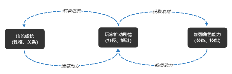 如图所示,角色在剧情中的成长,在原有的玩法循环上给玩家增加了一层动力