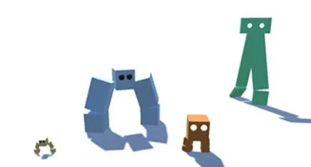 在接下来的很多试验当中,既有各种各样造型的角色(例如身形巨大的、超级长腿的、大脑袋的)也有各类没有明显关联的机制。其中在较早时期,“合作玩法”就显露出了潜力。由于单是一个两足机器人的情形下看起来容易显得孤单,主创们自然产生了尝试多个一组的想法。为了让趣味更足,那些不同身材的机器人就都被派上了场。