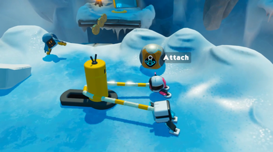 在一个场景中,一个小机器人需要爬到一个大体格机器人的肩上才能跨越高墙;而在另一个关卡里,两个体重不同的机器人必须一起小心翼翼地在平衡木上通过。(这一玩法最终保留在了完成的游戏中)