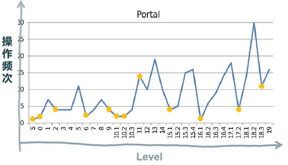 2) 它也可能是游戏过程中的需要玩家进行手动操作的频率。Linehan等人就曾记录了52名玩家在玩《传送门》时的操作次数,将所有关卡需要的玩家的操作次数连接起来就构成了我们所勾画的游戏节奏。