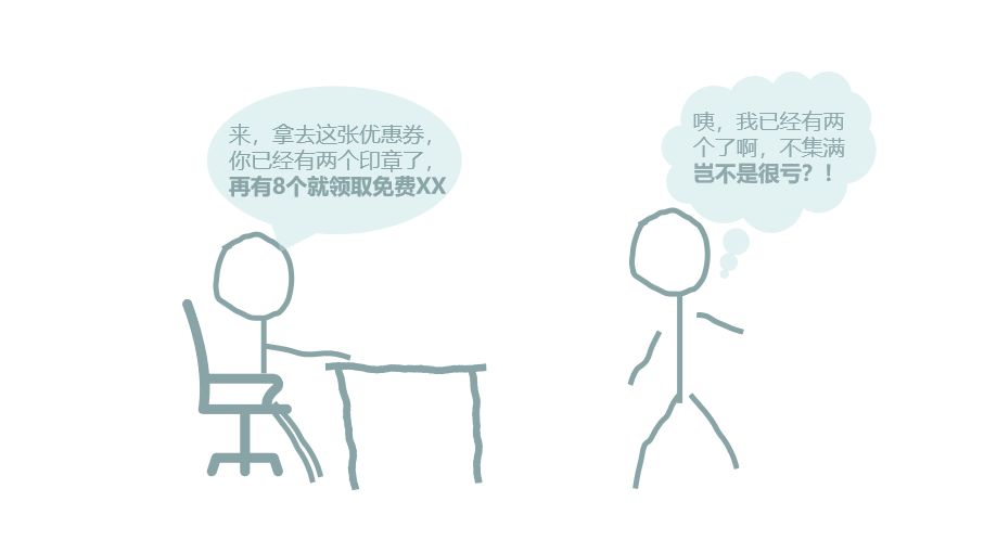 Nunes等人发现了这一现象:他们让洗车行随机给客户发放了300张特殊的优惠券,客户可以通过在这些优惠券上收集印章来兑换免费的洗车服务(每消费一次洗车服务就获得一枚印章)。但这些优惠券中,有150张是直接要求用户收集8枚印章,而另外一半则需要客户收集10枚,但却已经预先贴有两枚印章了。试验的结果很明显:拿到前者的客户只有19%的用户完成了收集,而拿到后者的则有34%的用户完成了收集。