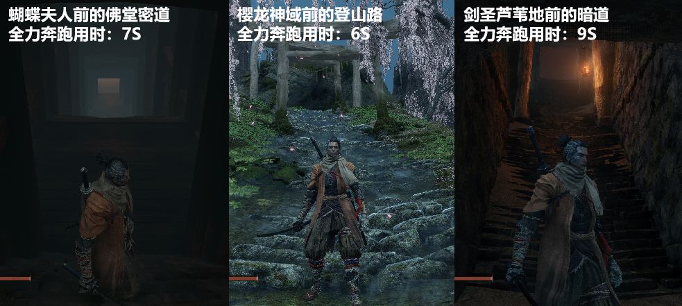 -The design: 在《只狼》中有着一些相当重要的剧情BOSS,比如蝴蝶夫人、义父、樱龙、玄一郎和剑圣等等。而在面对这些BOSS之前,我们需要先打败一些精英敌人(比如蝴蝶夫人/义父前的蚺蛇重藏),然后我们还要跑过一条相对安全的道路才能见到这些BOSS。在这些道路上,玩家即使全速奔跑也需要不少的时间,比如蝴蝶夫人/义父前的佛堂通道、剑圣前的芦苇地暗道、樱龙前的登山路等等。