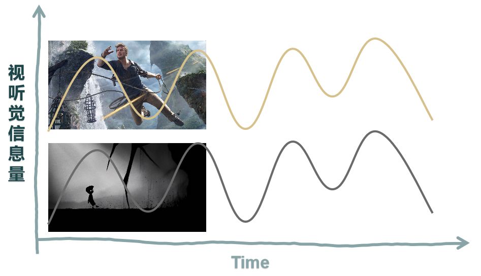 Pysch of Play的视频中简单对比了《地狱边境》(Limbo)和《神秘海域》(Uncharted)的信息量,Limbo的黑白界面,在整个游戏过程中的信心输入量整体是低于Uncharted的,但其两者也都有着信息流的高峰和低谷。