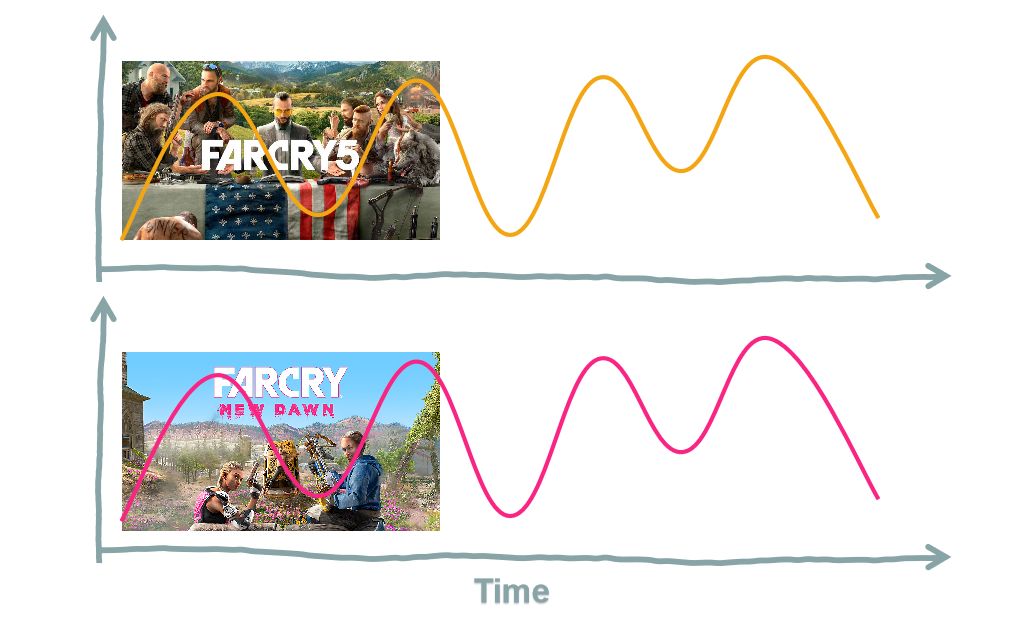 在讨论游戏节奏的时候,我们大概都会想到这样一张图,图中的曲线代表着张弛有度的节奏,体验的高峰和低谷穿透着整个游戏过程。