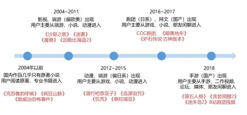 注:1.用户初次了解数据和占比数据来自《20190105克苏鲁用户问卷》,占比=各阶段了解克苏鲁的认知用户数/总认知克苏鲁概念用户数2.部分代表作品的时间归类为模糊归类,例如《沙耶之歌》发布于2003年12月26日,但开始有影响力应该是在2004年以后。