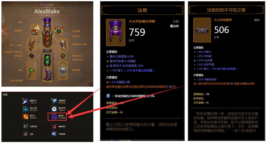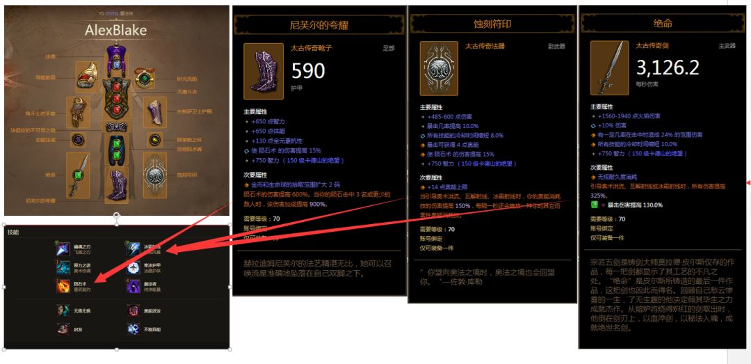 如图可以看出,该玩家的这两样装备是为“御法者”提供加成:增强输出技能的持续时间、伤害、降低CD(宝石镶嵌),其他装备为在该技能CD期内,补充输出(和增强生存能力)。