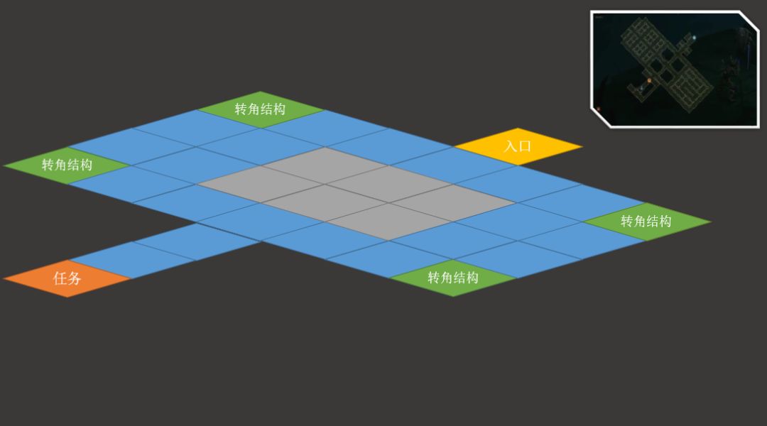 《Diablo》的关卡设计提供了一些PCG方面的启示,如下图,只需要关注入口和任务块的关键结构,整体关卡可以用数组来表示,数组可以是随机也可以是固定。其中数组的大小,入口与任务块之间的连接最小距离、怪物等级、精英怪密度、精英怪技能类型等都可用来控制难度。