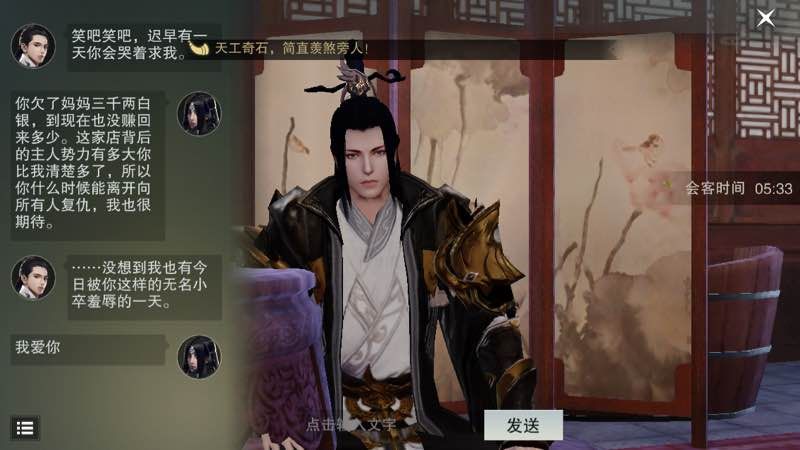 [ 玩家与蔡居诚在青楼点香阁的对话,其中有部分对话选项为策划定制,玩家也可以自行输入字句 ]