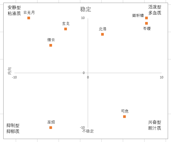 根据这些人物的性格,笔者主观地做了一个人设象限维度分析。