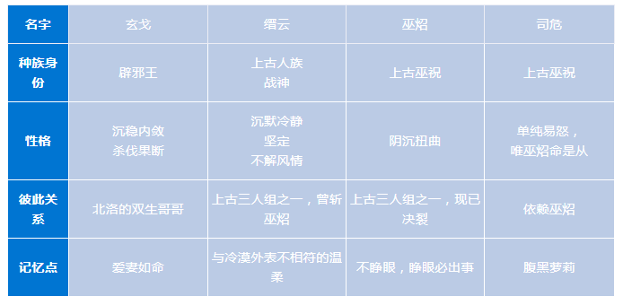 从表中可以看出,《古三》的人设群像塑造比较全面,基本把各种性格的人设都覆盖到了。尤其是有对手戏的角色,比如北洛和巫炤,玄戈和北洛,北洛和云无月,大多都分布在对应的象限中,从性格上做出了差分。这样在故事发展中的两两对应,人物就更容易爆出火花。举玄戈和北洛的双胞胎人设,一般来说双胞胎都是可以做性格差分的:玄戈在天鹿城辟邪族中长大,而北洛从小被抛弃,因此玄戈更沉稳,北洛更叛逆。这个性格差分还可以拉得更大,比如《青之驱魔师》中的磷和雪男,《白夜追凶》中的关宏峰和关宏宇,都是双胞胎兄弟中一个沉稳内敛一个痞里痞气的设定。