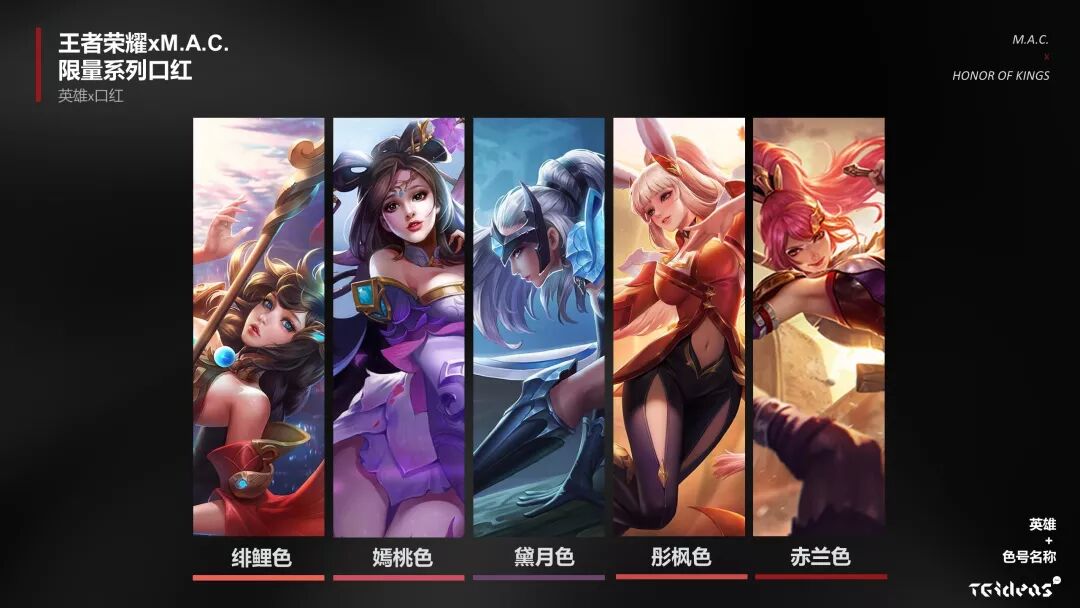 理论上做几款都可以,但因为王者是五人团战,所以这也是与游戏特色相关联的。而这五个色号的选择也是匹配了五个女英雄的角色设定,另外色号分布我们尽量覆盖到不同性格的女生,除了大众都认可的花木兰的中国红,也有色彩极具挑战的LUNA的蓝紫色。
