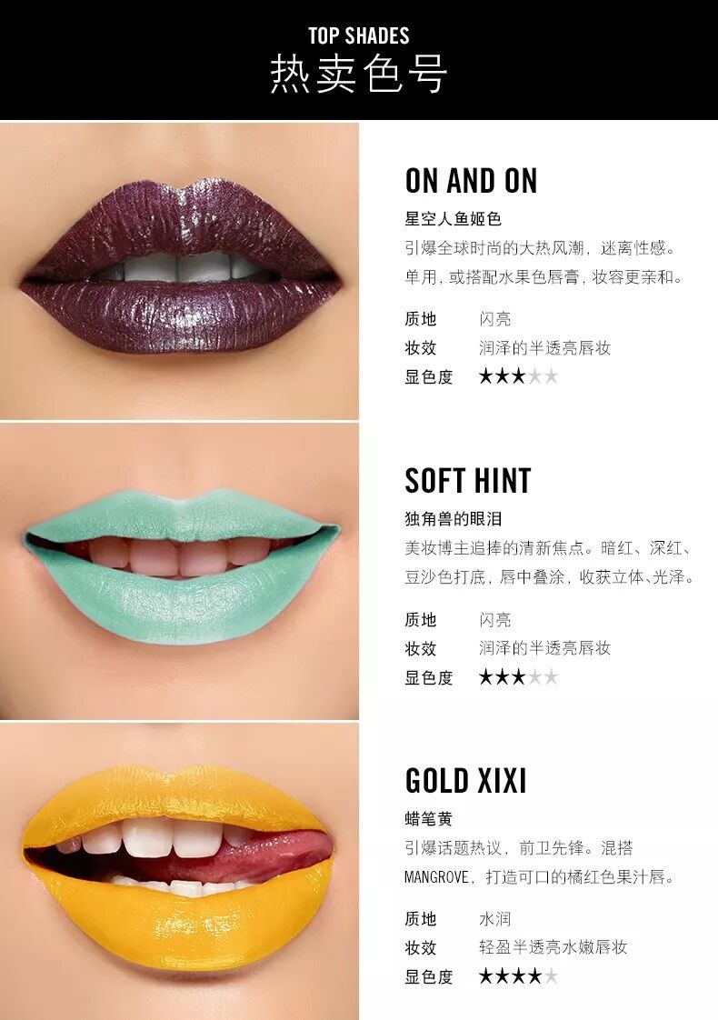 首先,色彩是我们找到的这次合作的关键词,它既是合作品牌M.A.C口红的核心竞争力,也是我们电竞少女性格特征的外在体现。所以大家可以看到不论是包装上的插画还是火箭少女的定妆照都有浓郁而大胆的色彩。其次加以中国古典颜色的命名赋予其中国文化的内涵。比如: