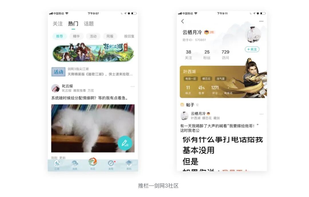 剑网3助手由曾经的「江湖daily」更名为「推栏」,沿用了本身游戏中与社交相关的意象,而这个意向也只有游戏玩家才懂得他的含义,让玩家更易与社区产生共鸣,强化情感连接。在视觉呈现上,延续了游戏江湖与武侠的意境,采用了唯美飘逸的风格,尤其是主页角色背景的水墨山水设计,简洁地表达了游戏的独特气质。