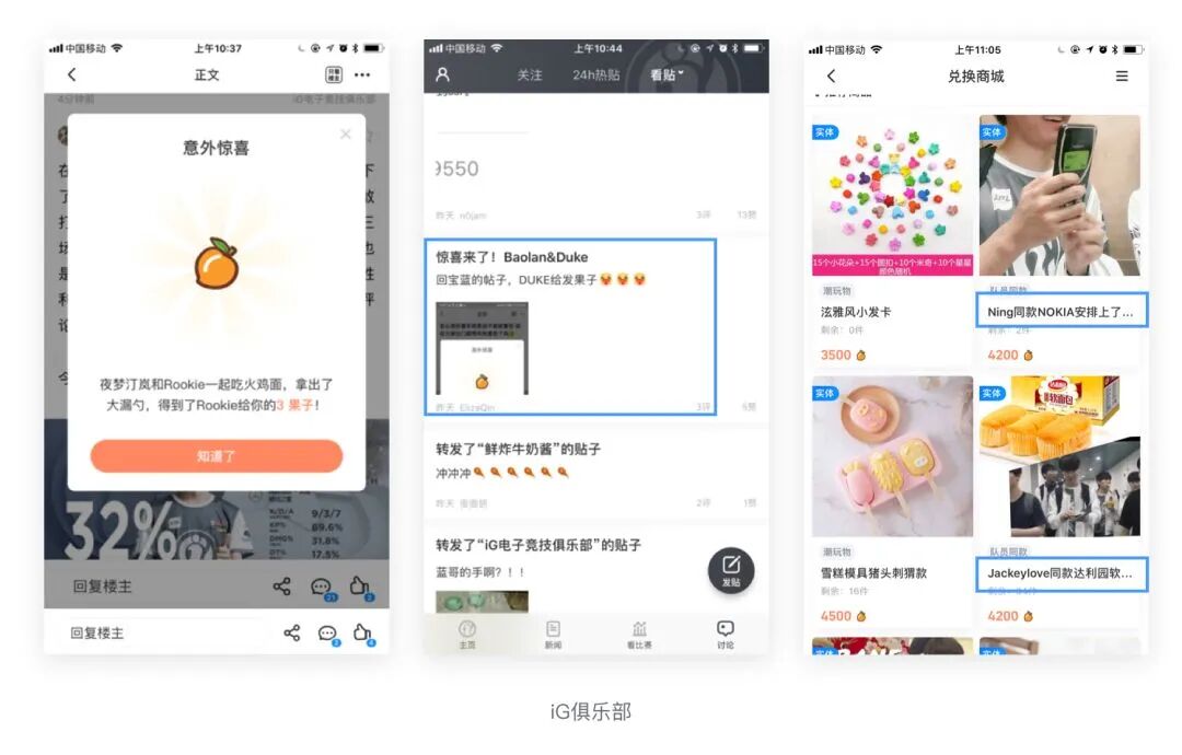 iG俱乐部app采用了更高明的做法:利用人们对未知结果的期待心理,将“积分掉落”的形式融入到玩家的社区行为中。玩家在社区内参与回复、点赞等,就有几率获得额外的积分。参与的行为越多,欧气越高,让玩家觉得在社区中有了一定的游戏化体验。同时将掉落的积分和app内容相结合,甚至形成了玩家在社区内自发讨论的氛围。社区内用积分兑换的奖励也非常贴合玩家的身份属性,同时非常会玩梗,让玩家觉得收集积分是有意义的。