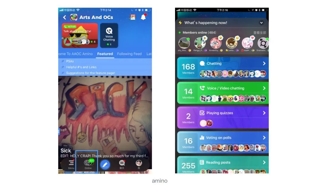 兴趣社区amino的一些做法,或许也可以为我们带来启发。amino通过兴趣圈子内“成员正在做什么”引导用户发现更多功能、关注同好用户;同时能感受到社区里有很多人和你在一起玩,营造社区的活跃氛围。