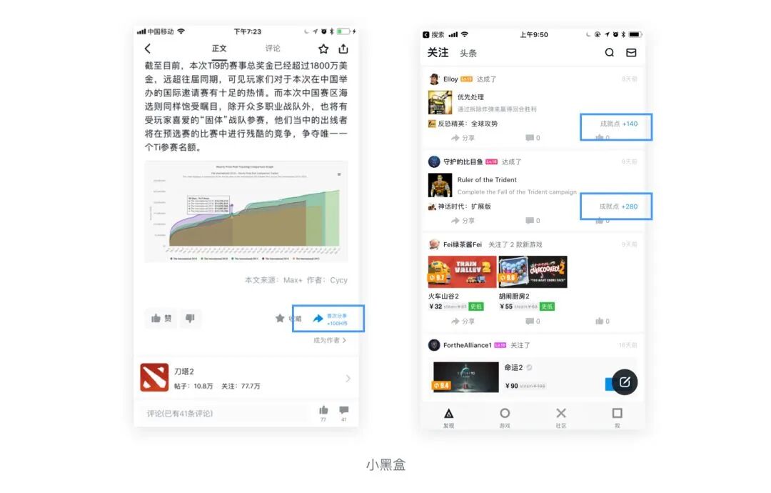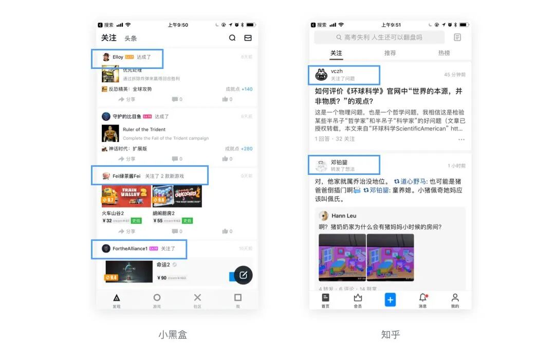 当玩家在社区内慢慢积累起“关注”的用户后,通过设计内容及行为在“关注”下的传播规则,可以让利用“关注”让更多用户产生的内容和行为被消费、讨论。小黑盒app中,玩家可以通过关注的用户,除了阅读到他发布的动态,还可以了解到他在社区中购买、评价的游戏,甚至一些特殊的游戏成就。知乎app中,可以了解到关注用户的回答、点赞、想法、收藏等多种行为产生的内容,从而通过人的传播形式,得到更多感兴趣的内容。