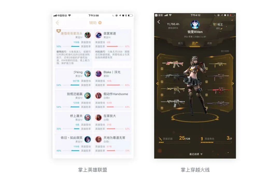 与游戏内容的打通是我们一直在尝试进行的,比如掌盟的对战助手功能——每次游戏对局开启前,推送双方战队对手的详细信息以及我方英雄出装推荐;掌火的战绩与资产展示等。