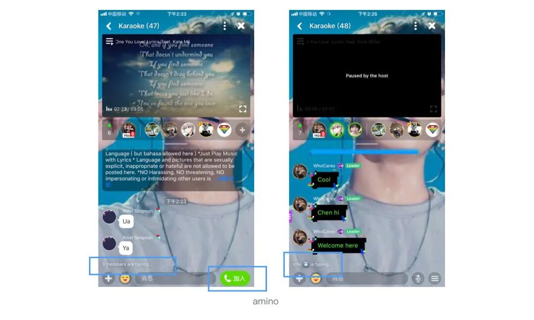 另外,amino在聊天室的设计上也用了许多巧思。聊天室内有多种玩法,如播放视频,上麦语音等,提供丰富的外部gif,支持搜索,让玩家有内容可发。同时显示“谁正在输入/多少人在输入内容”可以让玩家实时了解到聊天室内的活跃程度(即使当前暂时没有内容)。聊天室设计的进入退出机制可以正确区分出只看的人和加入聊天的人,使聊天室能够实时呈现正确的数据,不会导致看起来人数很多,但是实际上进来却发现没人在说话。