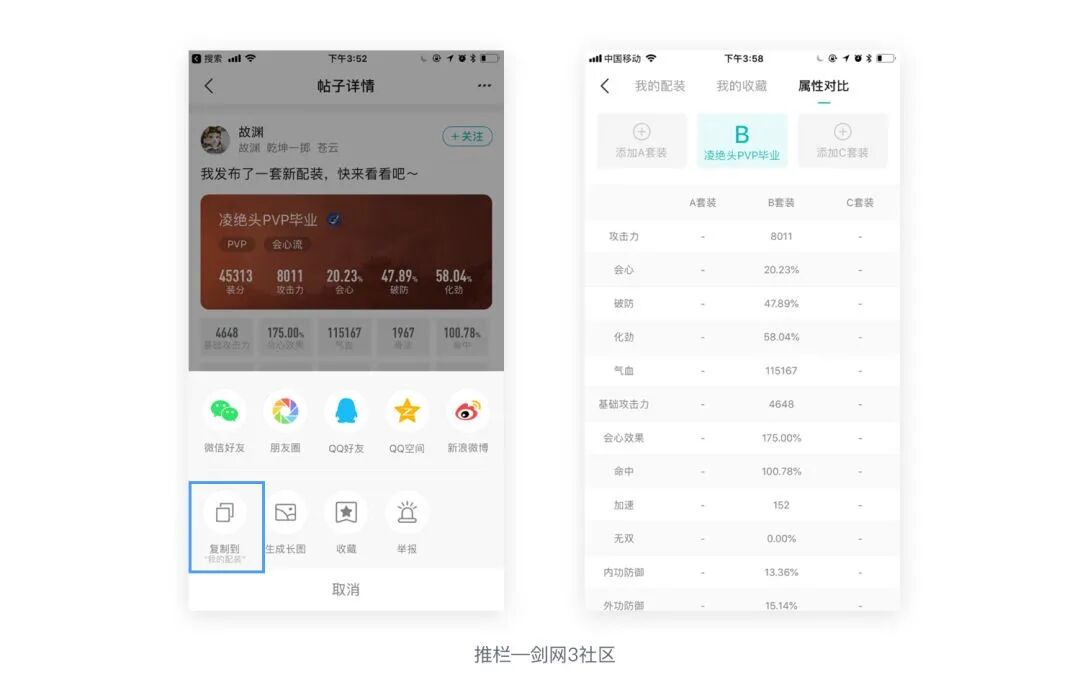 但我们在与社区内容的打通上还做的比较少。在推栏app(剑网3社区)中,玩家可以将自己的配装一键分享到社区中,同时在社区中看到其他玩家的配置也可一件复制到“我的配装”中,与自己的多个配装进行对比。这样的设计不仅使得玩家方便地应用了大神配置,更丰富了社区讨论内容、增强了玩家之间的互动。