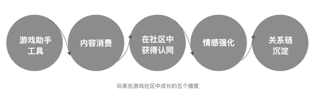 我们知道,做社区产品最重要的两点是“人”和“内容”。细分到垂直游戏社区产品上,除了这两点之外,还应该实现与游戏的结合,打造游戏——社区——游戏的一站式闭环体验。在此基础上,我尝试将垂直游戏社区的设计重点细分成以下五个维度,这五个维度一直伴随在玩家的社区成长路径中: