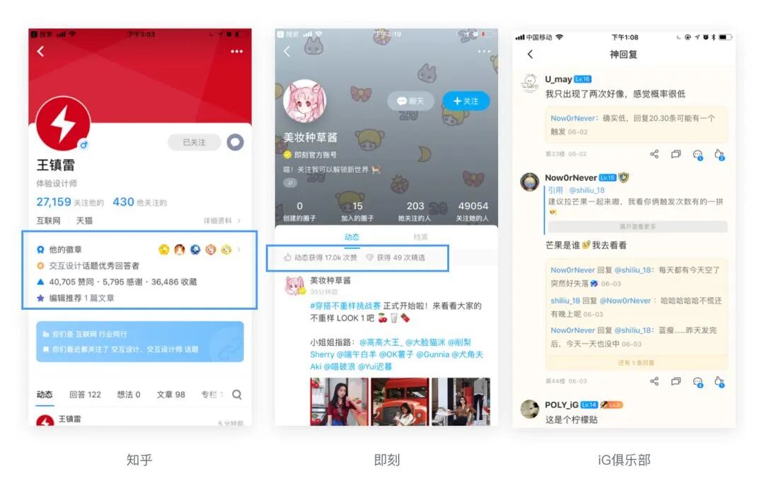 人作为社会属性的生物,当与社区里的人、内容产生互动后,即会希望得到他人的认同。当拥有他人认同时,就会变得异常的活跃和积极向上。对于PGC、头部UGC用户产生的内容,当获得上文提到的官方推荐时,会极大提升这批用户的认同感。同时,对于这些用户,用内容的点赞数、内容认证等来包装个人时,也会提升他们在社区内产生价值的认同感,从而刺激这批用户产生更多优质内容。此外,在iG俱乐部 app中,针对神评会通过视觉上的高亮,与普通回复做出区分,增加优质评论生产者的认同感。