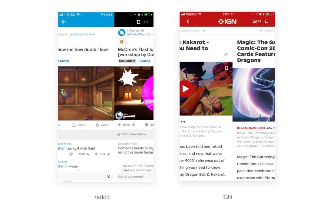 UGC为主的社区动态内容以feeds形式,将新的内容不断展示给玩家,吸引玩家不停地阅读。那么以OGC、PGC为主的作品也可以考虑增强玩家的沉浸式体验。reddit、IGN app里采用了横向滑动手势,支持用户一直沉浸地阅读下一个内容,避免阅读完一条内容需要先退回到列表中。
