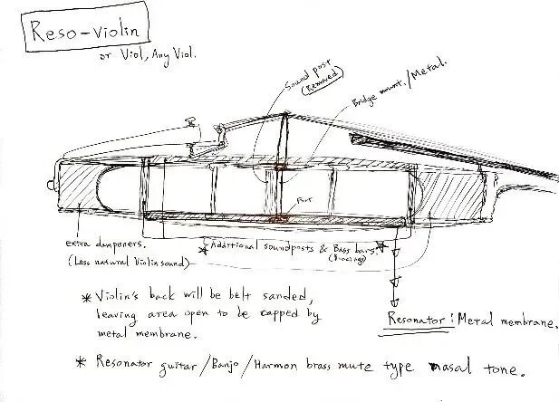 Resononce violin的想法非常大胆——将一把普通的小提琴背板挖出一个洞,给它加一个金属盘作为振膜。小提琴在演奏高音区时声音接近普通小提琴,但是中低音区的音色非常有意思——沙哑,粗粝,很带劲。和普通小提琴华丽的音色形成鲜明对比。