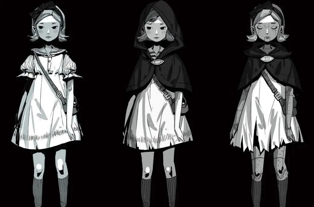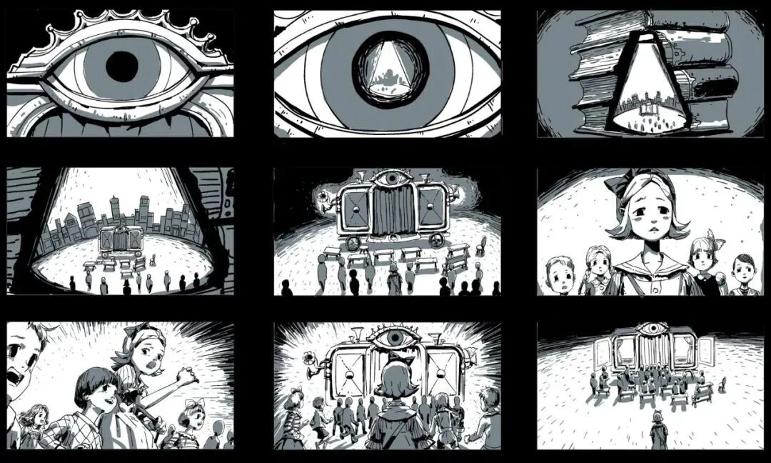 在游戏中段,花车出现在一段2D的cutscene(剧情画面)里。伊丽丝误闯入一本巨大的魔法书。她看见一群孩子在围观一场精彩的木偶戏。花车里洒满了糖果,孩子们兴奋极了。随着表演的深入,两个木偶人加入了表演。他们手拿针线,扣子和纸人在空中飞舞,扣子一个个落在了孩子们的眼睛上,他们的眼睛被缝了起来,灵魂被剥夺。扣子的表达其实借鉴了电影《鬼妈妈》(Caroline)里的设定——眼睛变成了扣子,孩子变成了木偶。这是一个关键情节——让伊丽丝意识到奶奶的魔法书实际上是这一切的来源——奶奶可能就是那个剥夺孩子灵魂的人。这段剧情是一个大反转,花车算是见证者。木偶表演必然有音乐,具体是什么样的呢?它可以和整个故事发生什么关联。这是在归纳线索的时候想到的。也是我把花车音乐定义为游戏音乐主题的原因之一。