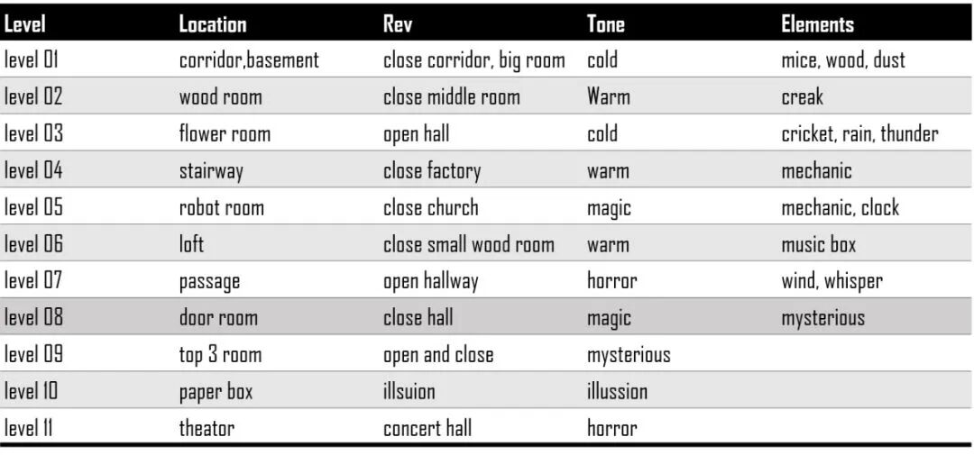下面这张表则定义了每关的基本氛围,在初期设定时尽量保持每关都有变化是最起码的需求。这样可以保证玩家不会在一种环境氛围里太久而产生厌倦。每关的Tone都根据剧情和场景做了设定。我也故意在一些氛围上拉开差距,比如第一关是在地下室,它的氛围更为破旧,整体氛围就故意做的偏冷,而当她进入小房间时氛围就会故意偏暖一些。虽然这个房间还是挺阴森,但是这里的一系列谜题我都希望可以给玩家一些温暖的感觉,也为Home主题做一些铺垫和暗示,这关出现的两条音乐相对也更诙谐和温暖。