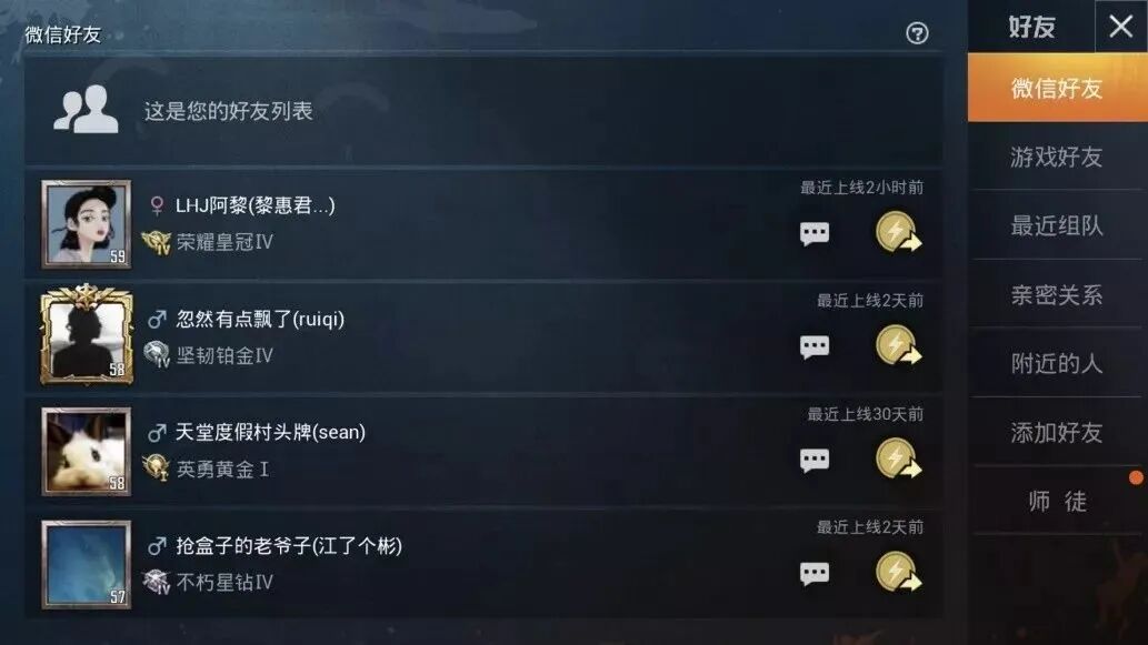 与游戏相比,现实容易孤独而隔离。而游戏可以帮助我们团结起来,从无到有创造更强大的社群。社群让人感觉很好,就像是有了归属,融入其中,一起积极地关心某样东西。一群有着共同利益的人开始互动以促进这一利益时,社群就出现了。在游戏中提供了“公会”、“军团”、“师徒”等社交系统,只要我们愿意,只要我们需要,就能够和别人建立关系。如《和平精英》中的社交系统: