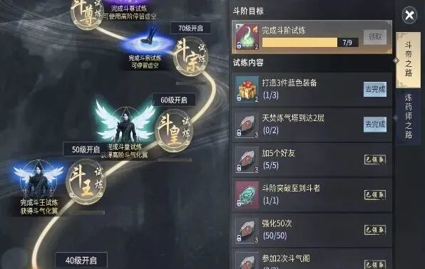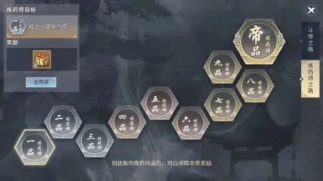 在RPG类游戏中,比如《斗破苍穹》,在登录界面已经展示出来了大目标“斗帝之路”,在系统中有两个大目标可追求—“斗帝之路“ 和“炼药师之路”, 在“斗帝之路”目标中,拆分了12里程碑目标。要实现每个里程碑目标,玩家在游戏内还要做各种主线任务或者支线任务,让玩家一步一步变强。如下:
