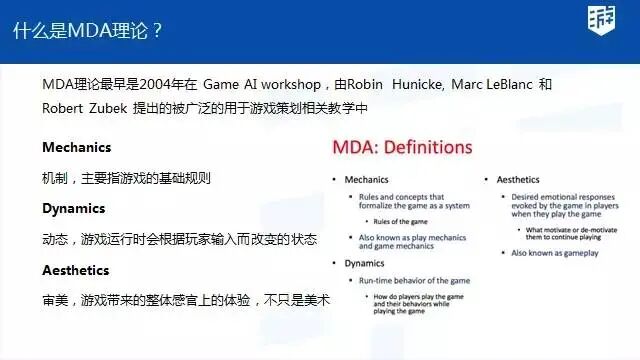 在目前国外的游戏专业学校中被提及较多的一个理论是MDA理论,在游戏设计中机制(Mechanics)动态(Dynamics)美学(Aesthetics )(MDA)架构是一种检验和分析游戏的工具。