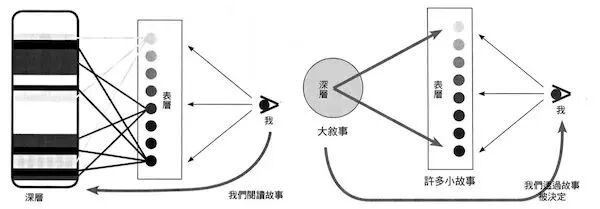 根据东浩纪的观点,所谓的现代世界,是指在我们的意识中反映出来的表层世界,而另一侧则是规定了那个表层的深层,即“大叙事”所存在的世界(图a)。这也是以现代学问为前提的世界观。另一方面,后现代世界不是正如图b所示的数据库模型(读取模型)所理解的世界吗?并不存在像是规定了整个世界的隐藏大叙事,而是根据读取的不同,表现出各种不同的情况,这不正是后现代世界吗?例如,即使游戏消费者只玩一个游戏,但他当然不仅仅只接受这一个故事,也接受所有那些不同版本的故事。网络也是如此,根据不同人搜索的内容,出现的图像也会以各种各样不同的形式呈现。
