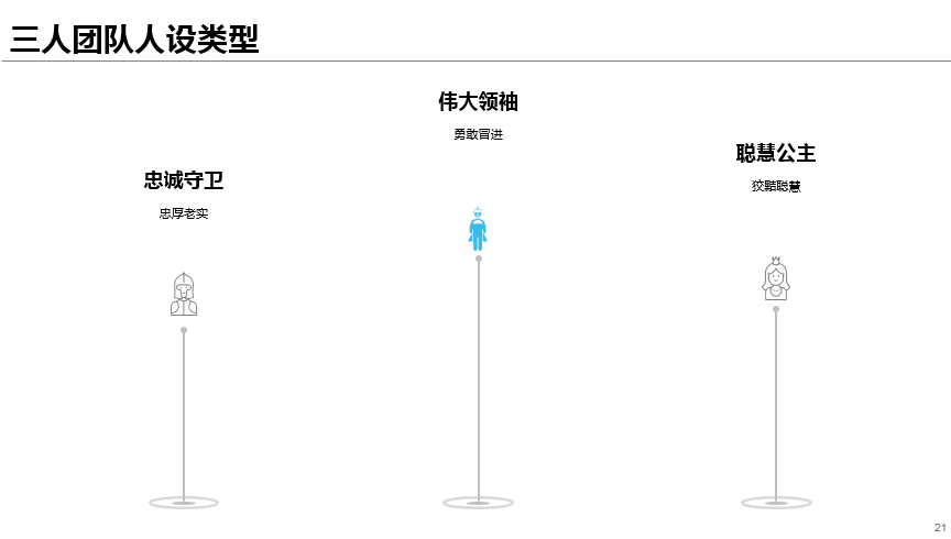 当团队的人数上升到三个人之后,最为常见的人设类型是:伟大领袖+忠诚守卫+聪慧公主。这是一个非常西方化的经典团队人设。