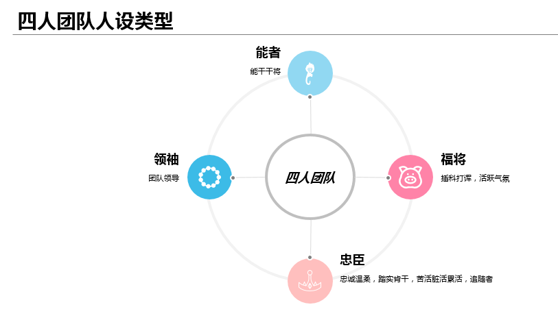 接下来,我们讨论一下四人团队人设,最经典的模式是:领袖+能者+福将+忠臣。