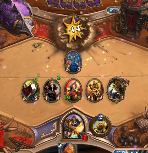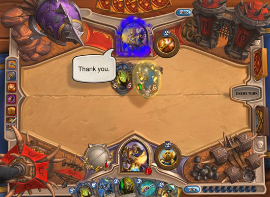 [ 图中的牧师安度因(上)使用法术牌盗走了骑士乌瑟尔(下)刚刚打出的一个强力卡牌(牧师桌面闪着金光的那一个),安度因发了一句“谢谢你”嘲讽对手给自己送了个主力。]
