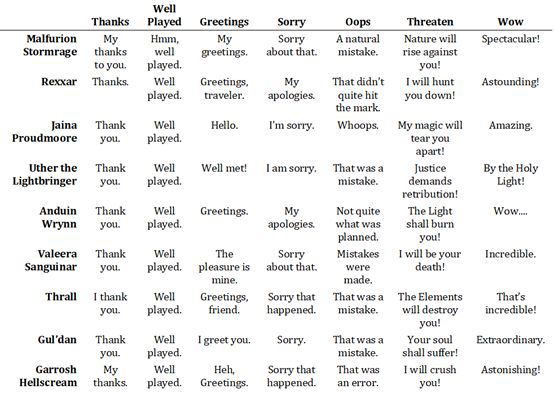 上面图片中的六个语句表情只是一个基本标准,但每个英雄的表达方式都不一样,不同英雄会用不同的词汇、语音语调来表达出这六种语句表情,以展现他们的个性。下表列出了九个职业的最初英雄表达原始六个语句表情以及后续新增的“惊叹”表情的方式。