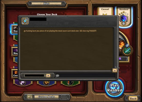 还有种理由是因为对手使用了某一种恶心的战术。在最初的数据收集时,猎人角色特别惹人讨厌,因为猎人有一组魔鬼操作的套牌可以在对手做出反应之前就把其打死。许多玩家经历过这种魔鬼战术,所以他们会认为向使用猎人角色的玩家做出一些坏行为是合理的。