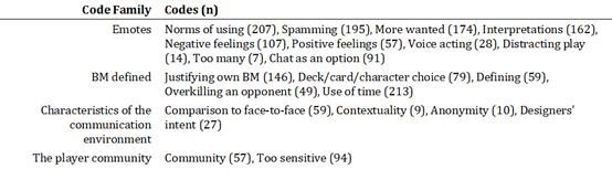 与关于其他多人游戏的研究类似,我们的分析表明,对关于表情的含义和用法的活跃讨论的一种解释是:“文化不仅关心正在玩的游戏,而且还关心它是如何玩的,以及玩家如何玩的”(Elmezeny和Wimmer,2015年)。(Elmezeny&Wimmer,2015)。